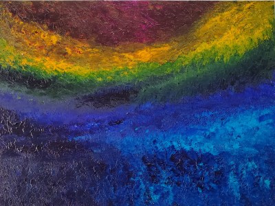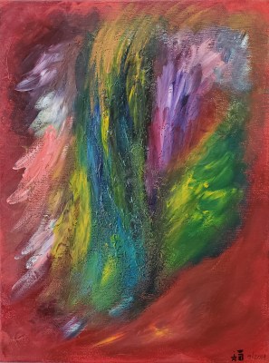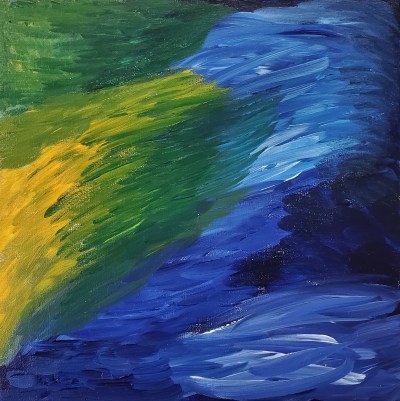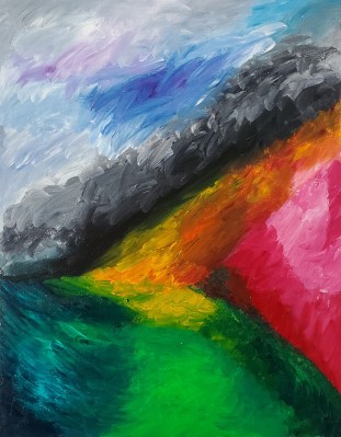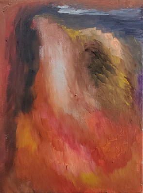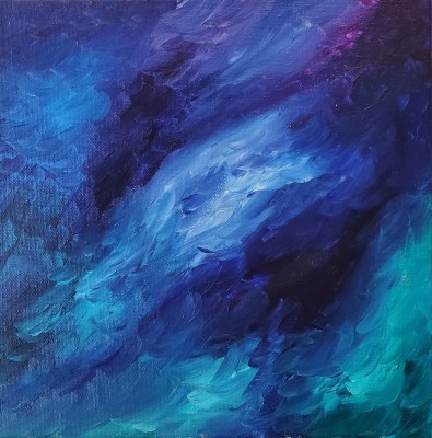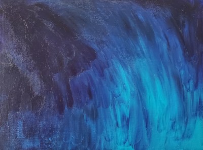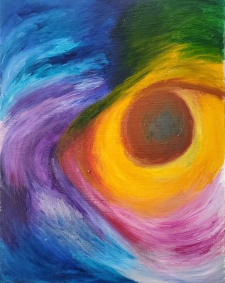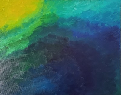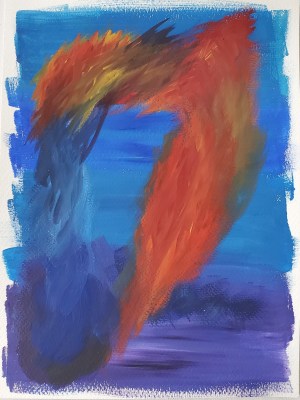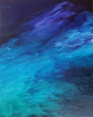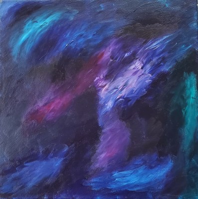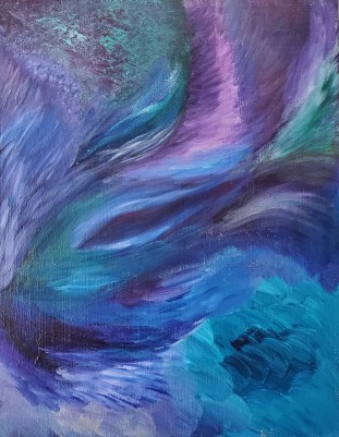 I was reminded of a flight of birds or other winged creatures. Unfortunately, the first hospital visit didn’t completely stabilize me, so I had to go a second time at the end of September, after which I was very depressed, angry, and conflicted. My art reflected this with its contrasting yet somehow muddled colors and completely vague shapes. I was painting just to paint and have something to do.