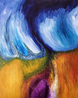 Finally, themes of a re-emergence of sorts manifested in the motifs, with brighter blues and other colors, though no less chaotic in appearance. Indeed, the bottom right image is called “Soulstorm”, as it reminds me of a tornado. By this time, my depression was lifting, though, and I was feeling better, due in no small part to getting to reduce one of my more debilitating medications. You can still see something of a “division” in all of these paintings, though.