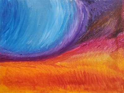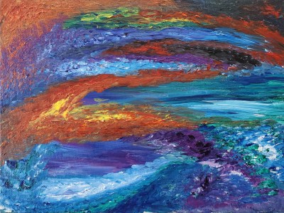 These were all done with regular or gouache watercolor paints, and I couldn’t help but notice the prevalence of fire. It looked like dragon breath to me. The best thing was how much fun it was to do: I got an immense amount of happiness out of learning how to blend and spread the colors around to get different effects. The thing is, watercolors and gouache aren’t really intended for the kind of painting I was doing: I wasn’t diluting it and was going through a lot of paint. So one night I decided to join my son in trying out the acrylic paints, with the following result: