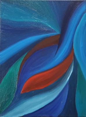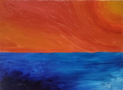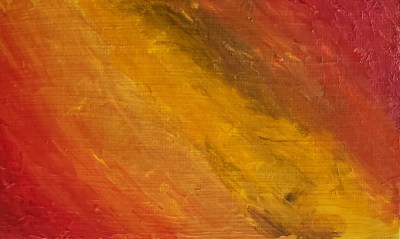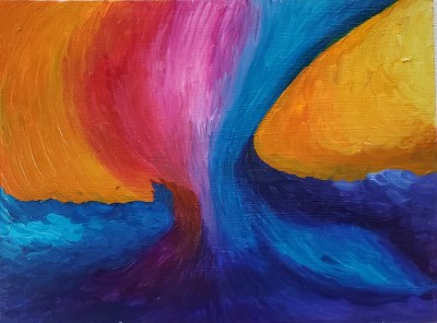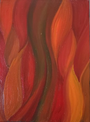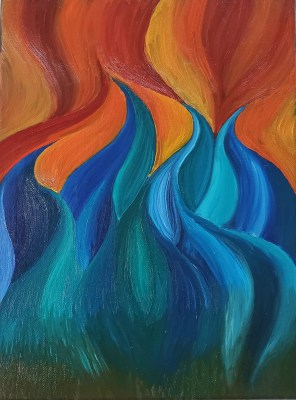 It was much easier to get nice hard lines as well as get the kind of blending I often strived for with acrylics, but didn’t always get. Obviously I still had something of an internal division between “hot” and “cold”, but it didn’t seem as extreme as some of my earlier similarly contrasted pieces, which reminded me more of ice and lava than fire and water like these do. I don’t normally have an outcome or purpose in mind when I paint, but the fourth piece is a deliberate attempt on my part to contain my fire, as it were. I don’t want it to go out completely: it’s creative fire rather than destructive fire, but both can burn if they get out of control.