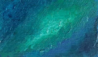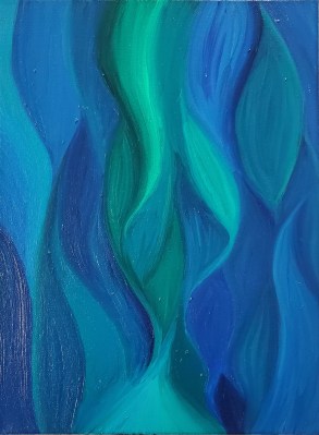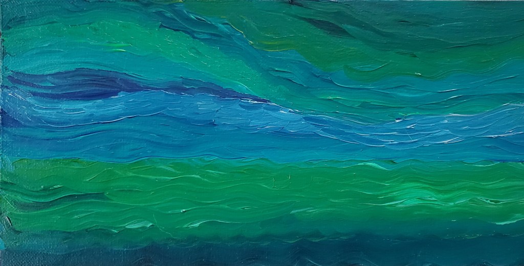 I also started using more green in my paintings around this time, which represented life to me, and they lightened in shade, like I was surfacing from the deep waters of the much darker “underwater sunlight” paintings (part 2). Generally speaking, I was feeling better, with only the odd bad day. Best of all, I was sleeping well, save for a spell when my meds were being adjusted, which always screws with my sleep. Once that was settled out, though, it was all good and most nights I sleep quite soundly. This is remarkable in that I have *never* slept well. Ever.