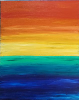 The last of these is one of the few large canvases I’ve done (most are 12″ or less in width or height) and shows my fondness for rainbows, gradients, and sunrises/sets.
